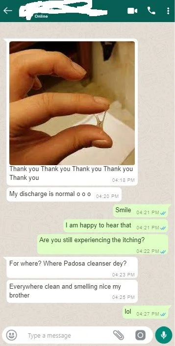 “Thank you to for the infection cleanser, I feel so great, complications are gone, also the discharge i was having has disappeared, the delivery was prompt too, i feel very better, I highly recommend this product”.